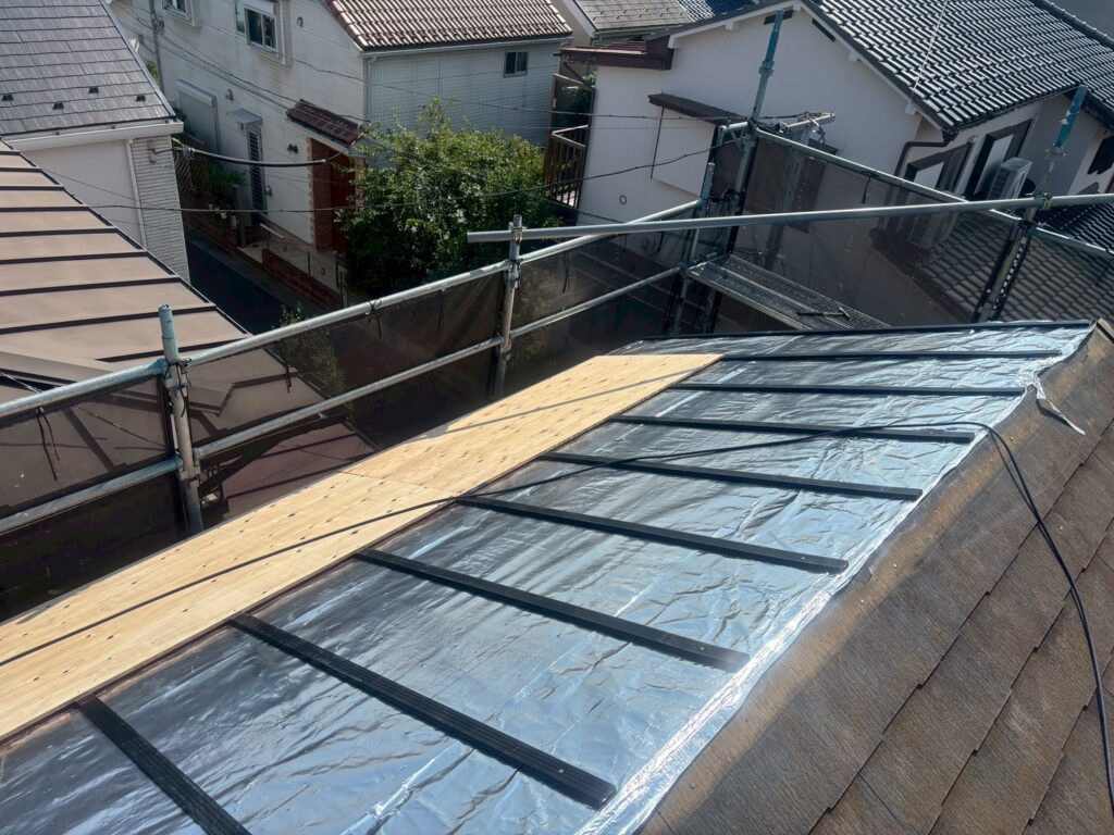 遮熱シートと野地板合板の間に空間を作らないと、遮熱効果が下がってしまう為、このような胴縁で下地を作ります。